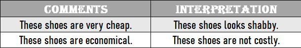 Choice of Words: It refers to choosing the appropriate words while communicating. Consider the following example, where are remark about someone's shoes using two different words leads to entirely different interpretations by the receiver. The table given below list the comments and interpretations.